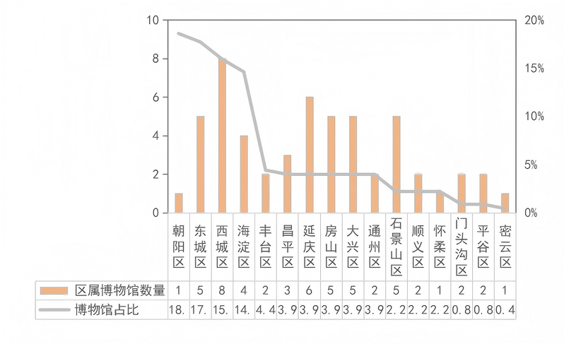 區(qū)屬博物館形成“核心集聚、外圍開(kāi)花”的空間格局。超五成區(qū)屬博物館集中在西城區(qū)、延慶區(qū)、東城區(qū)、石景山區(qū)、房山區(qū)和大興區(qū)六個(gè)區(qū)。其中,西城區(qū)、東城區(qū)作為北京博物館高度集聚的“核心區(qū)”,分別坐擁8家、5家區(qū)屬博物館。在城市外圍,延慶區(qū)、房山區(qū)和大興區(qū)等區(qū)域分別擁有6家、5家和5家區(qū)屬博物館,博物館建設(shè)正在從中心向周邊蓬勃發(fā)展,形成了“多點(diǎn)開(kāi)花”的空間布局。